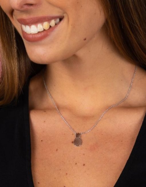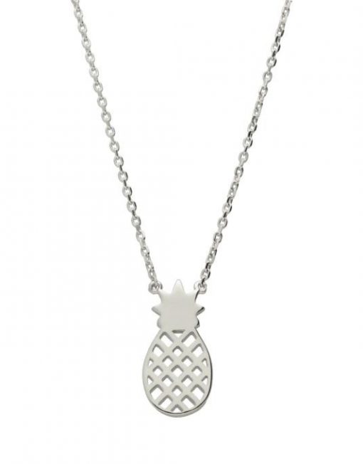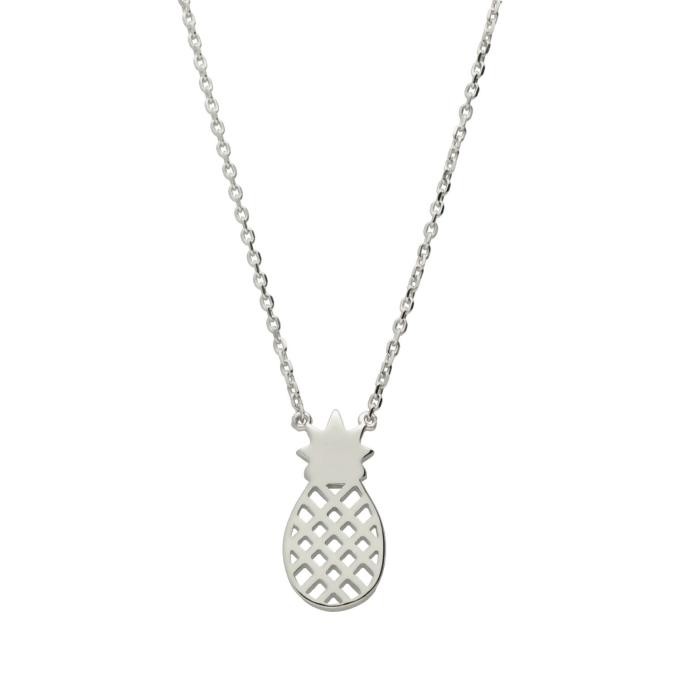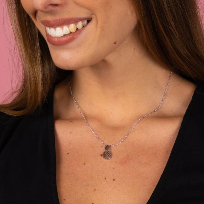 Collar de plata de ley 925 bañada en rodio de piña. Cadena de 42 cms de largo más 3 cms de alargador y cierre tipo reasa.