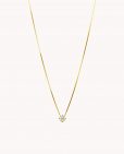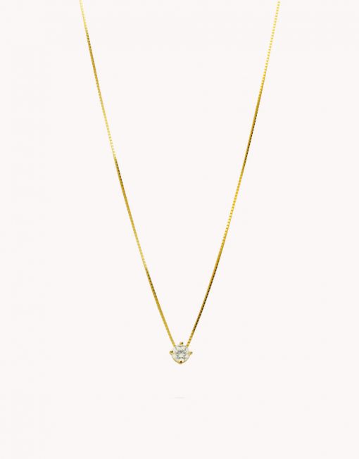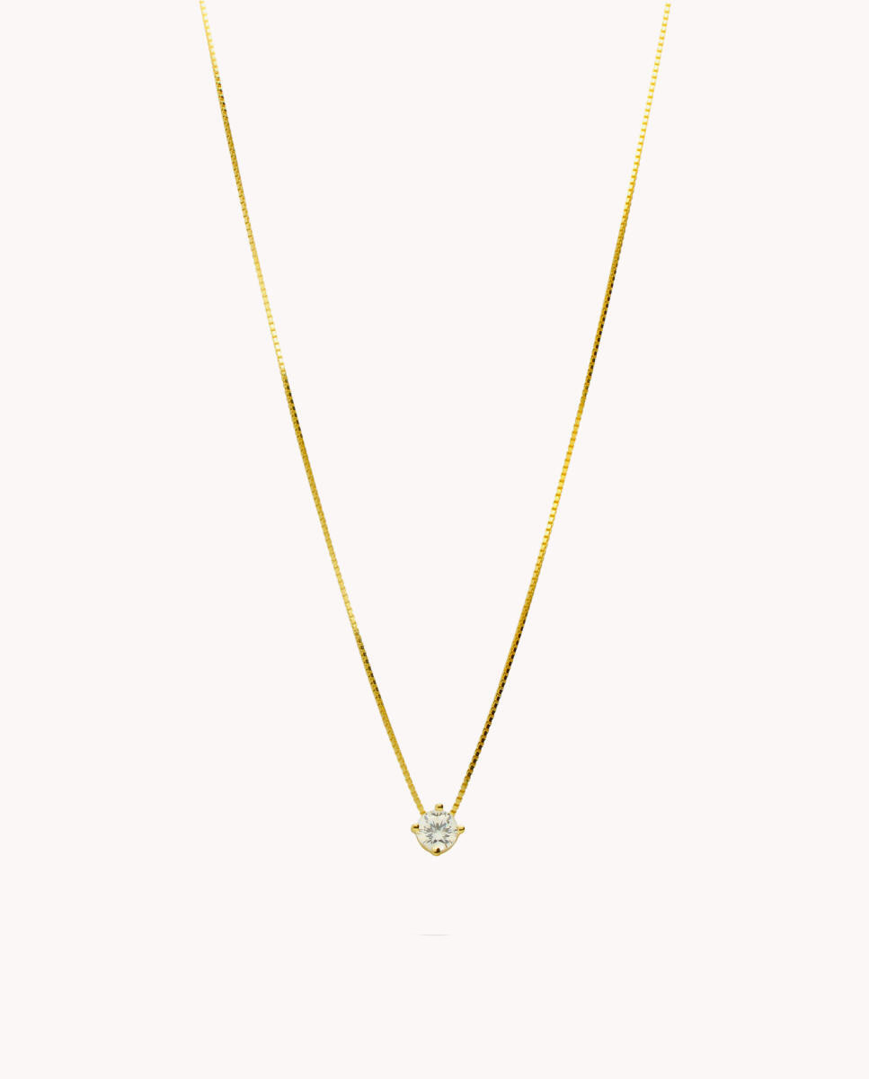 Collar de plata de ley 925 bañada en oro 18K con colgante de circonita blanca de 4 mm de diámetro engastada en cuatro garras, cierre tipo reasa y largo de 38 cms más 4 cms de alargador.