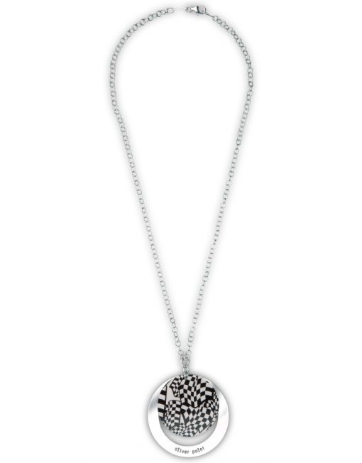 Inspirada en los años 60 y en el Op-art, los juegos geométricos en blanco y negro crean la línea más vanguardista y rompedora. Las joyas están realizadas en plata 925 y estampadas en optical print