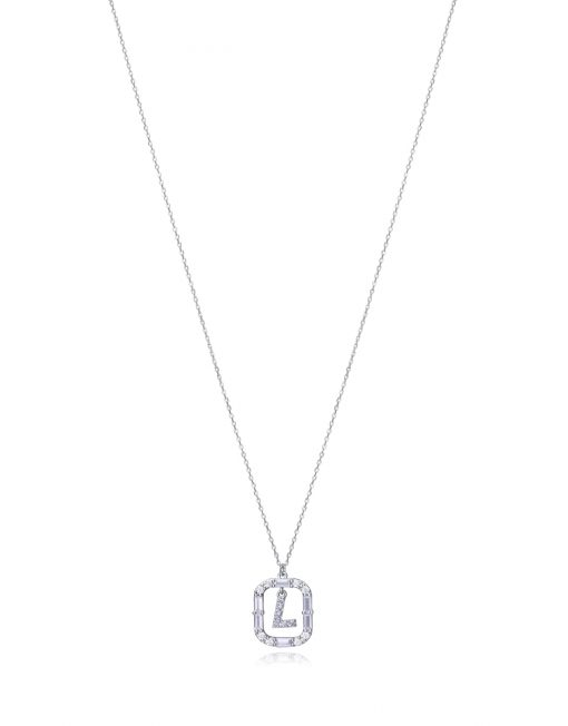 Collar con la letra L de plata y circonitas blancas de 42 cm de largo. Luce una joya personalizada y realizada con los mejores materiales, con extremo mimo y cuidado. Un colgante que te acompañe siempre, con el que llenar de buenos momentos la vida. Brilla como solo tú sabes. Longitud: 42 cm.