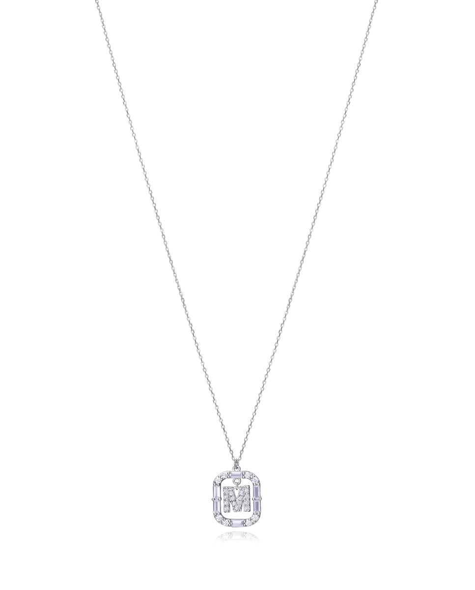 Collar con la letra M de plata y circonitas blancas de 42 cm de largo. Luce una joya personalizada y realizada con los mejores materiales, con extremo mimo y cuidado. Un colgante que te acompañe siempre, con el que llenar de buenos momentos la vida. Brilla como solo tú sabes. Longitud: 42 cm.