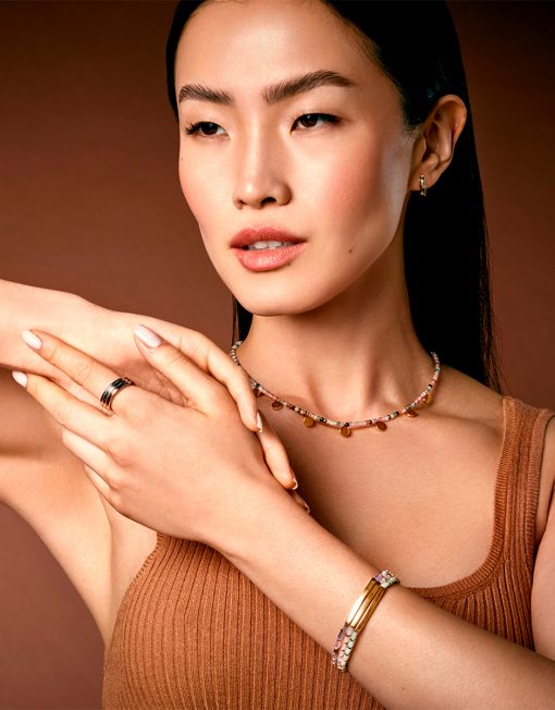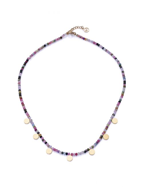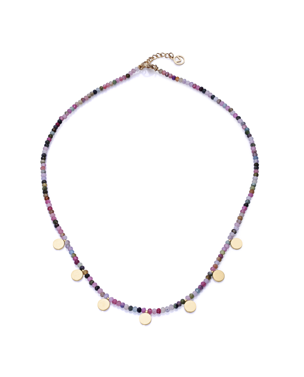 Bonito collar de acero dorado con piedras naturales multicolor y turmalinas de 42 cm de largo. Los detalles en oro fusionados con lo vivo del color de los minerales dotan a este colgante de una fuerza sin igual. Ambos ingredientes crean un complemento original y alegre. Una pieza bellísima que te acompañará para siempre. Longitud: 42 cm.