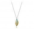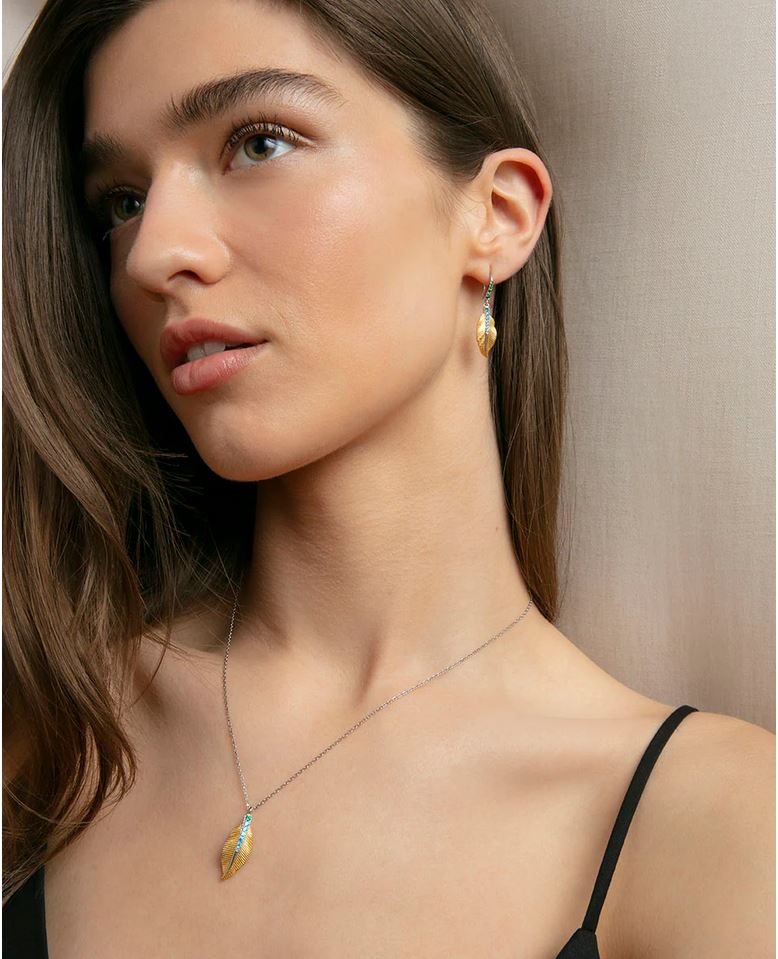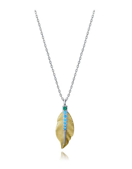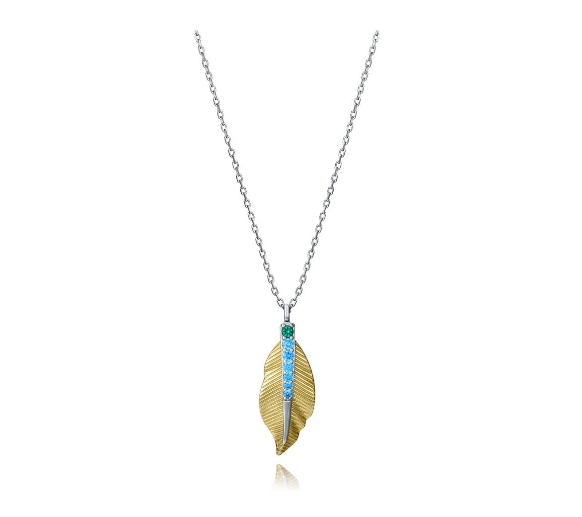 Con un diseño lleno de estilo y frescura, este collar de plata de primera ley con baño de oro y rodio presenta un colgante en forma de pluma adornado con una fila de circonitas verdes y azules. El contraste de colores aporta un toque vibrante y sofisticado, ideal para realzar cualquier look. Con un largo de 42 cm más 3 cm de extensión, este collar es una joya que combina elegancia y naturaleza, perfecta para quienes buscan un accesorio único y lleno de personalidad.