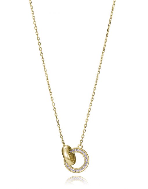 Un collar que simboliza unión y armonía a través de un diseño lleno de elegancia. Elaborado en plata de primera ley con un delicado baño de oro, se adorna con circonitas blancas que aportan destellos de luz y sofisticación. Su colgante, formado por dos aros enlazados, representa vínculos eternos y la conexión entre lo esencial y lo eterno. Con un largo de 42 cm más 3 cm de extensión, se adapta fácilmente a distintos estilos y escotes, convirtiéndose en un accesorio versátil y atemporal. Una joya pensada para mujeres que desean expresar elegancia, significado y distinción en cada detalle.