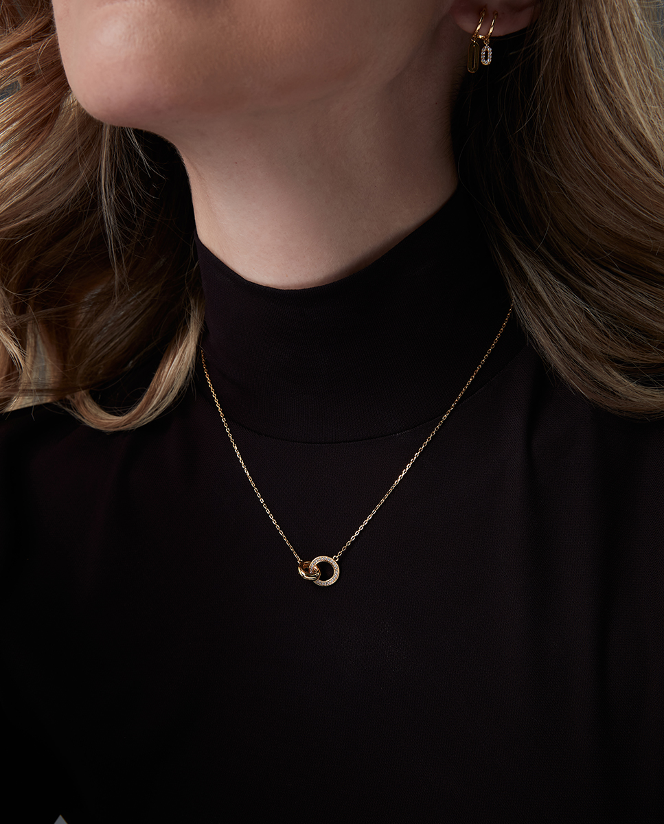 Un collar que simboliza unión y armonía a través de un diseño lleno de elegancia. Elaborado en plata de primera ley con un delicado baño de oro, se adorna con circonitas blancas que aportan destellos de luz y sofisticación. Su colgante, formado por dos aros enlazados, representa vínculos eternos y la conexión entre lo esencial y lo eterno. Con un largo de 42 cm más 3 cm de extensión, se adapta fácilmente a distintos estilos y escotes, convirtiéndose en un accesorio versátil y atemporal. Una joya pensada para mujeres que desean expresar elegancia, significado y distinción en cada detalle.