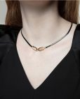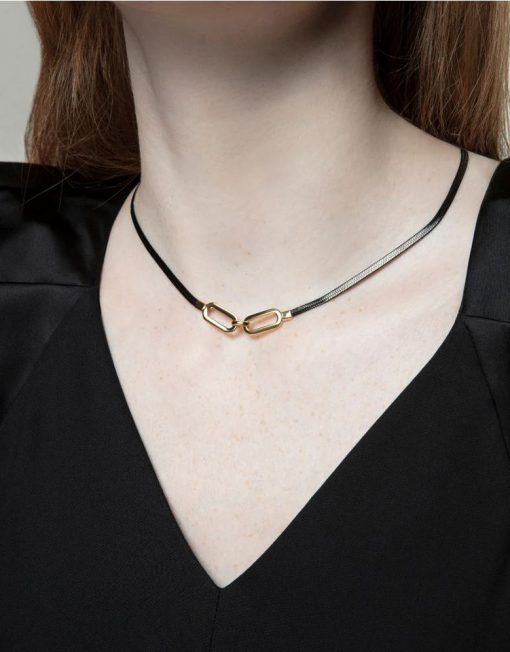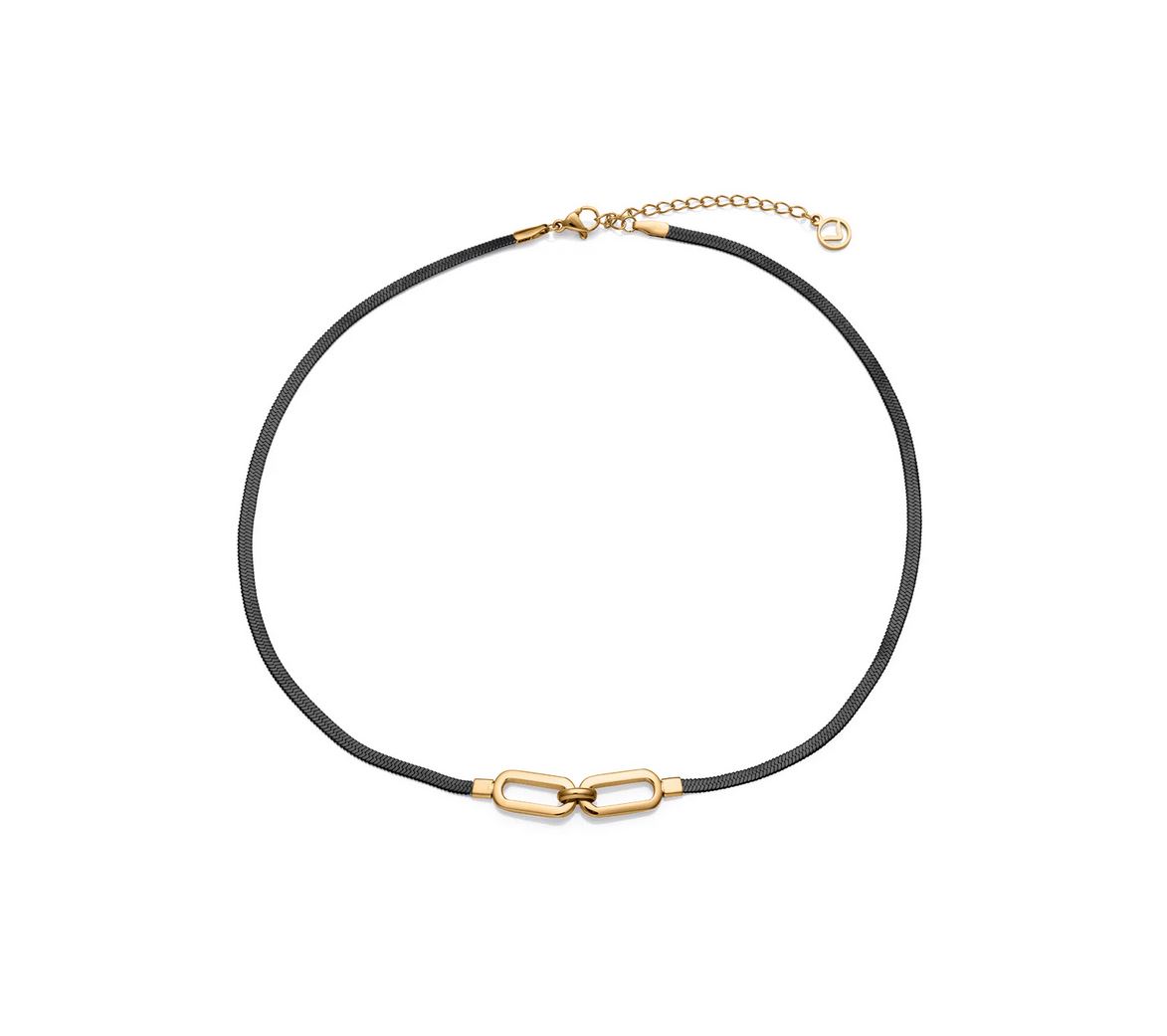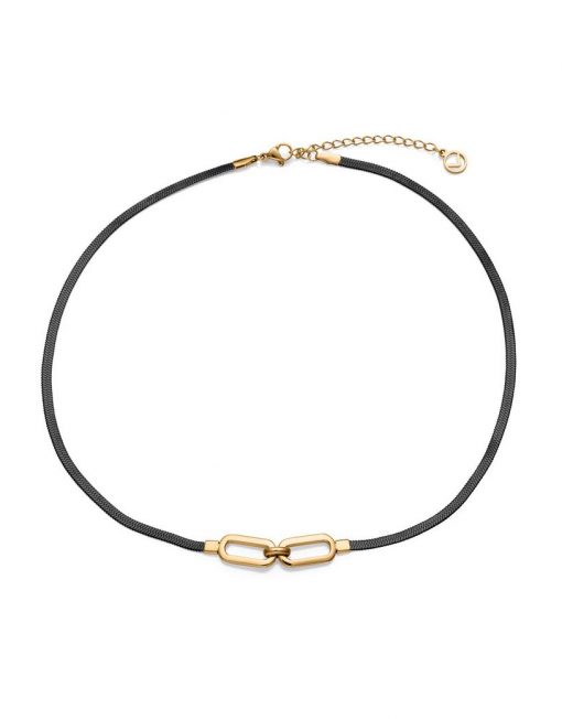 Collar de mujer en acero con cadena de serpiente en acabado IP negro, adornado con aros enlazados en IP dorado. Este diseño sofisticado combina el elegante contraste entre el negro y el dorado, creando un accesorio moderno y lleno de estilo. La cadena de serpiente añade un toque de suavidad y fluidez, mientras que los aros dorados aportan un elemento distintivo y llamativo. Perfecto para complementar tanto looks formales como casuales, este collar es ideal para la mujer que busca un accesorio con carácter y distinción. Largo 40 + 5 cm.