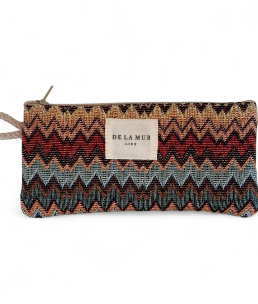 Funda de gafas con cremallera en la parte superior y pequeña asa de cordón de color beige en el lateral. Con tejido grueso de jacquard con estampado tipo zigzag multicolor. Cada articulo puede tener una variación en el estampado, dependiendo de donde se haya efectuado el corte de la pieza. Forrado de tejido grueso de color gris en la parte interior. Para su correcto mantenimiento se aconseja lavarlo en frío a mano y no utilizar secadora.