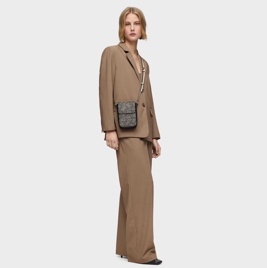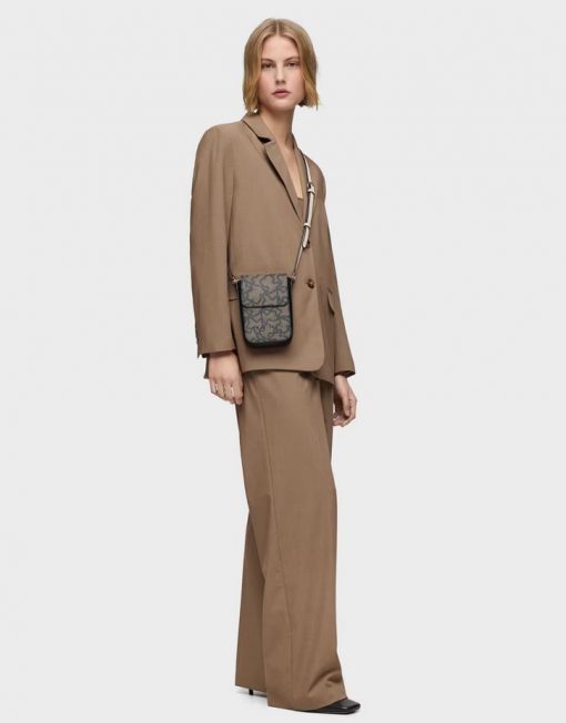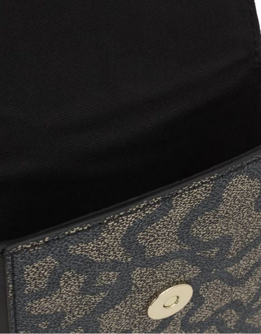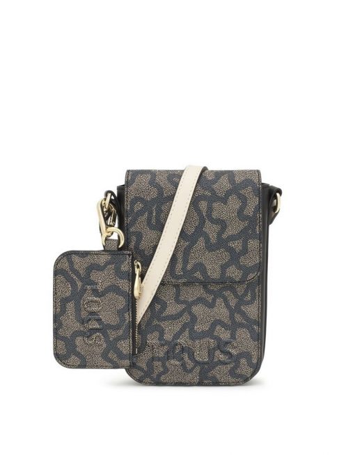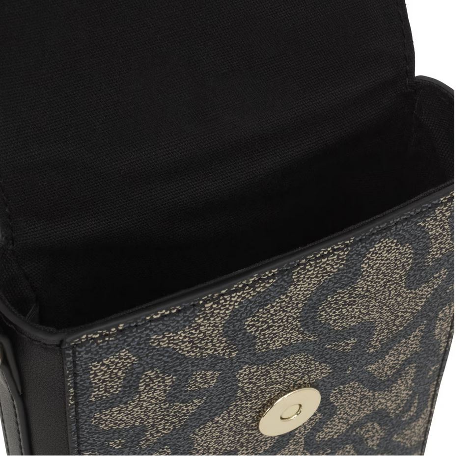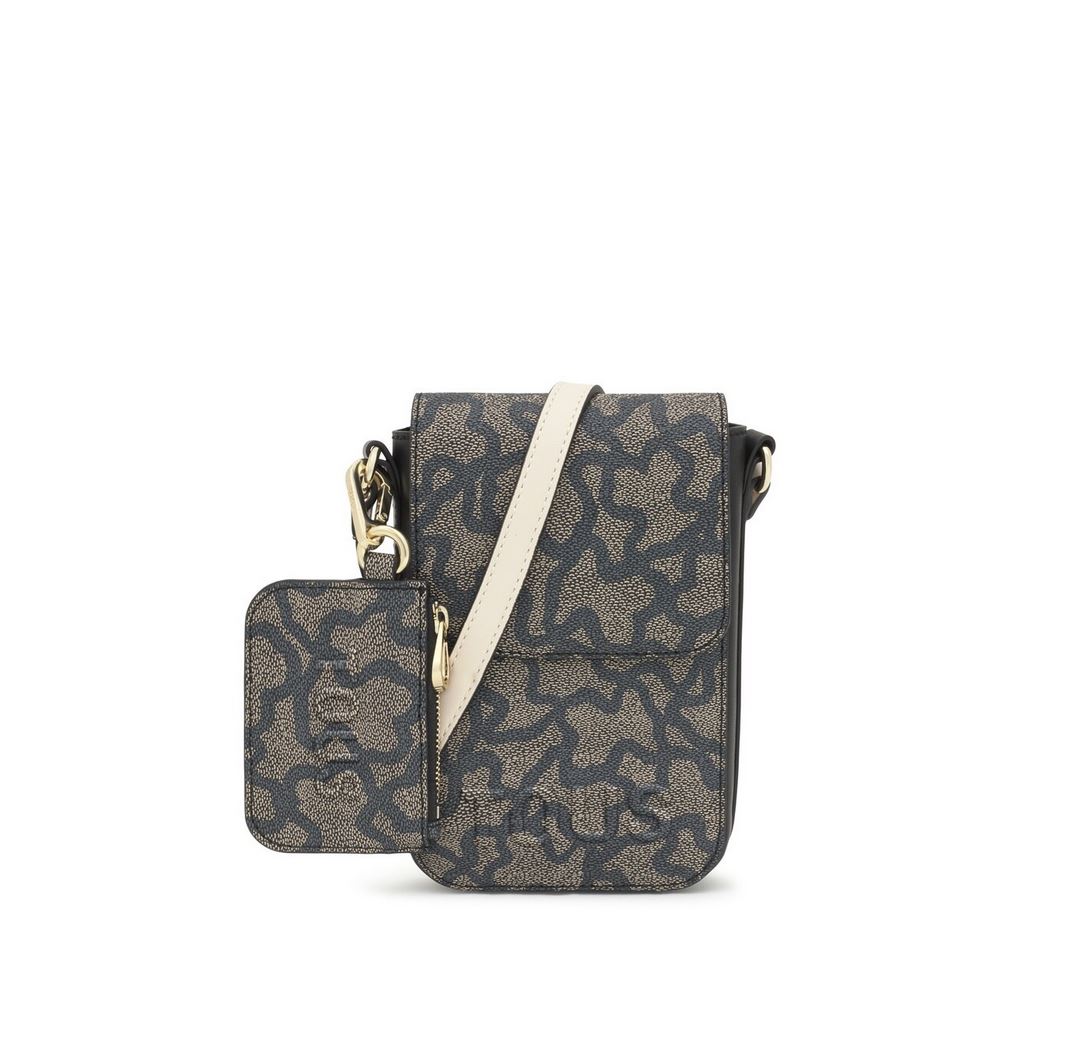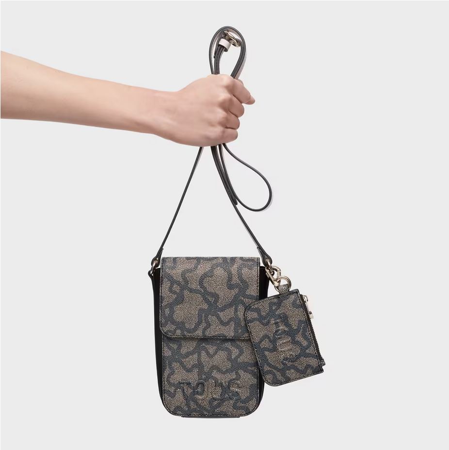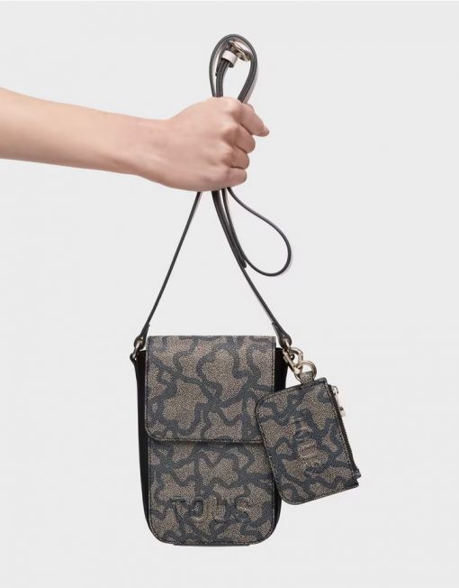 Funda de móvil colgante Kaos Icon de lona con detalles de piel sintética en color negro. Cierre de botón magnético. Tiene dos ranuras para tarjetas, una de ellas transparente. Asa bandolera ajustable. Medidas (alto x ancho x fondo): 19 x 13,5 x 4 cm.