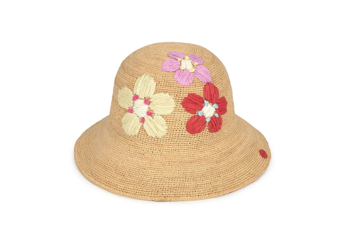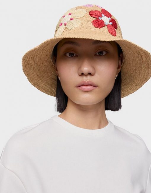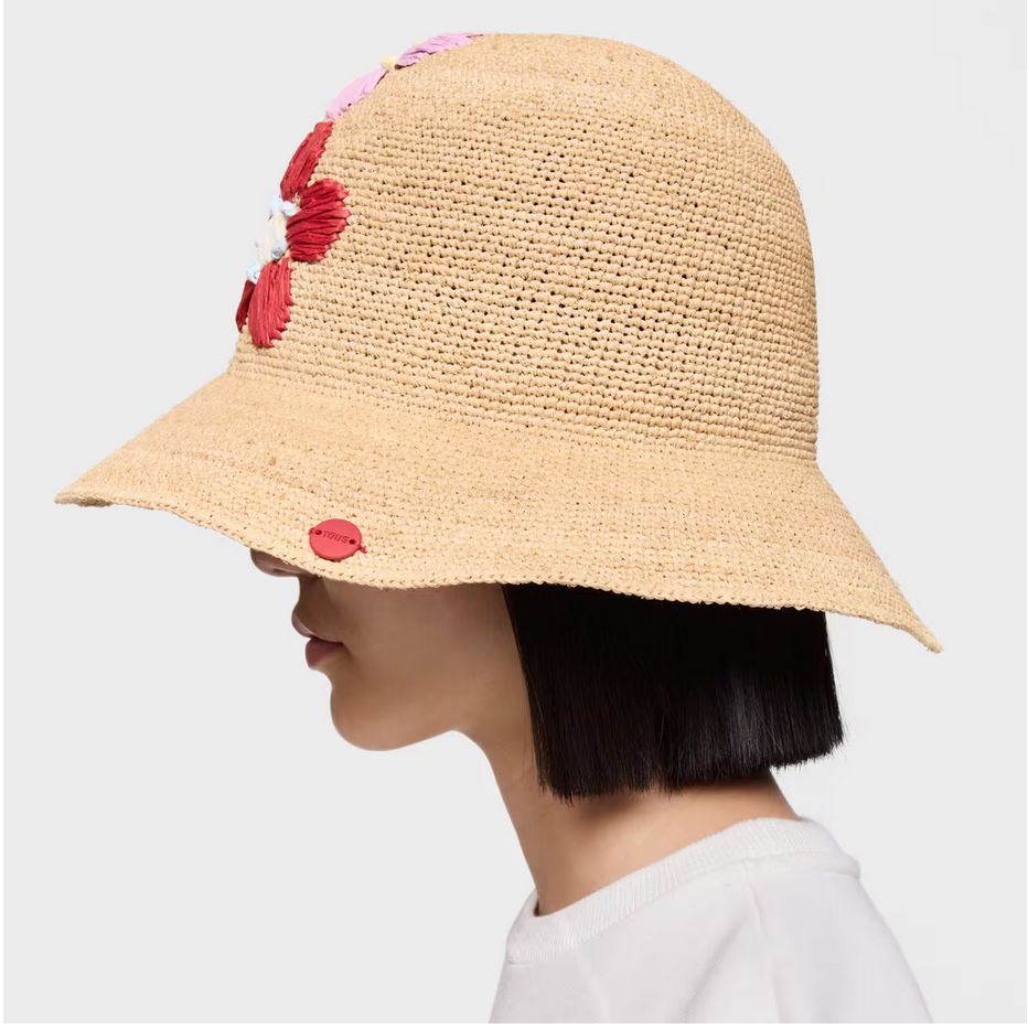 Gorro TOUS Summer Daisies de rafia en color nude.