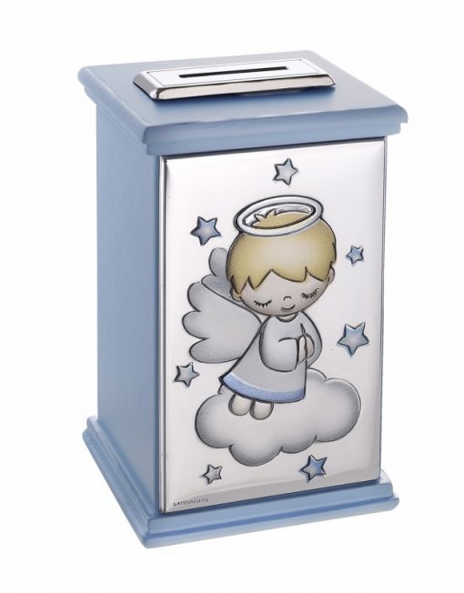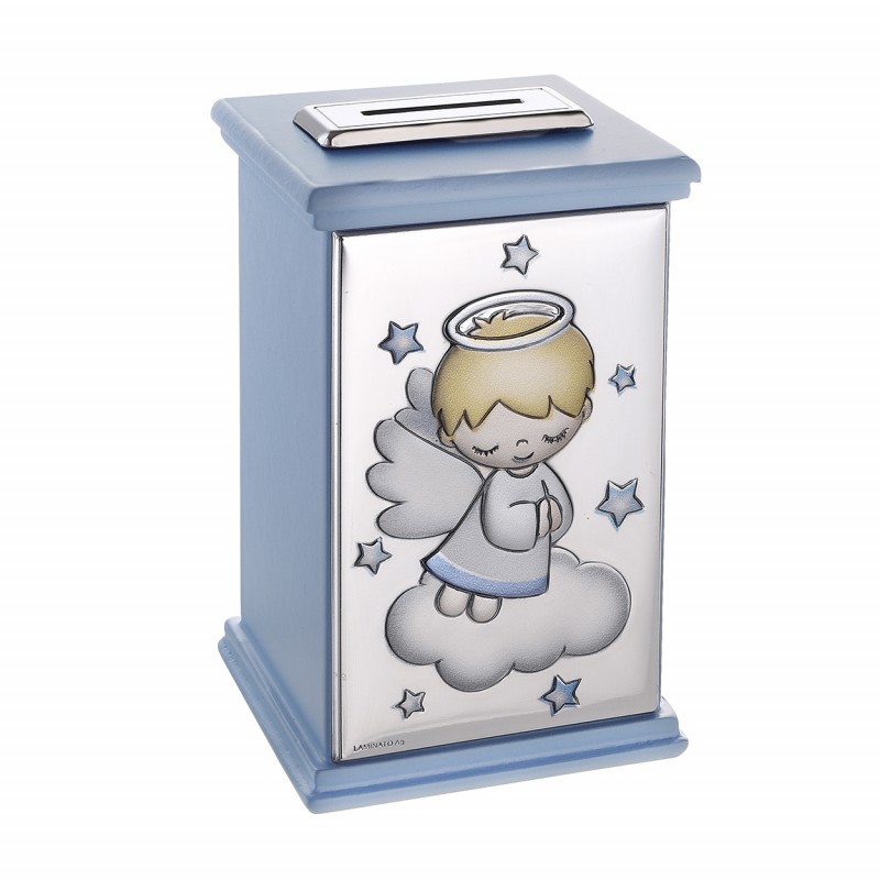 Hucha Angelito musical, celeste, 8 x 8 x 12 cm.