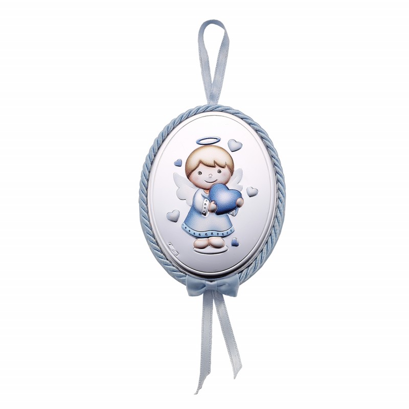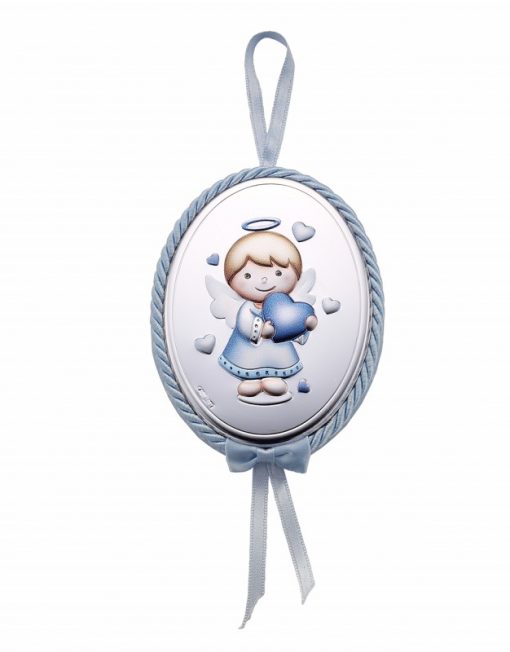 Medalla de cuna Angelito con corazon, detalles de esmalte, celeste, 9,5 x12 cm.
