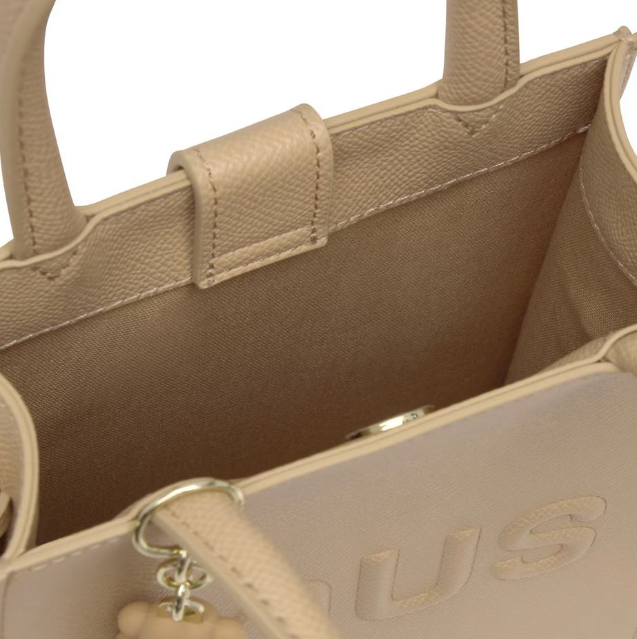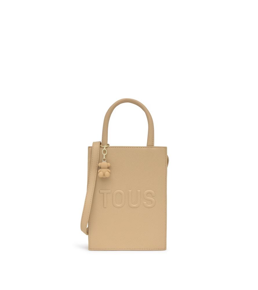 Minibolso Pop TOUS Brenda de poliuretano en color arena. Cierre con botón magnético. Asas fijas de mano y asa bandolera ajustable y desmontable. Incorpora un bonito detalle de oso colgante. Medidas (alto x ancho x fondo): 20 x 16 x 7 cm.