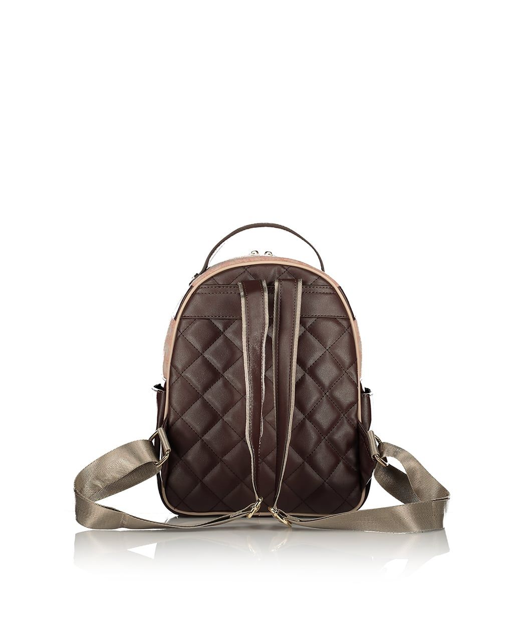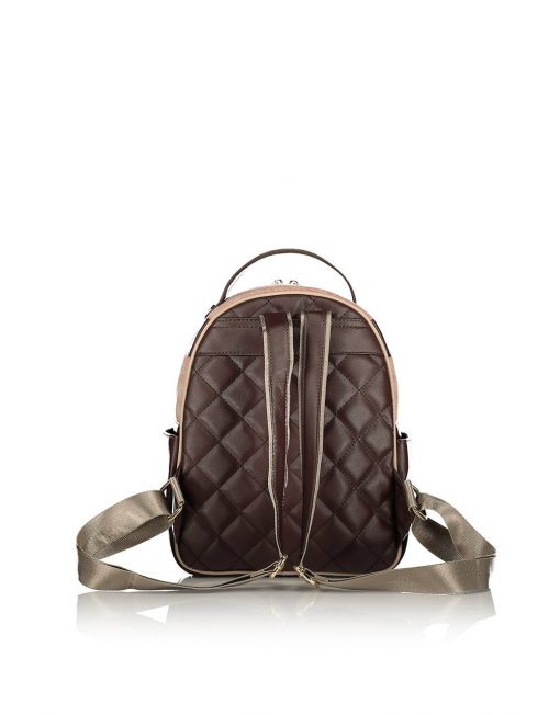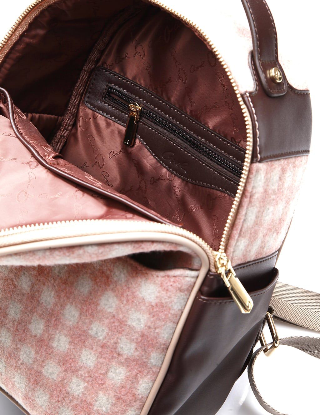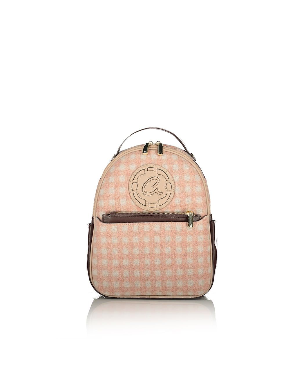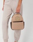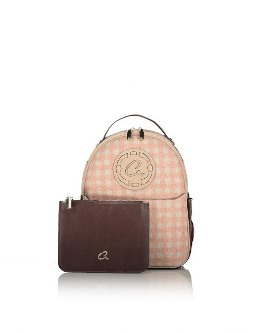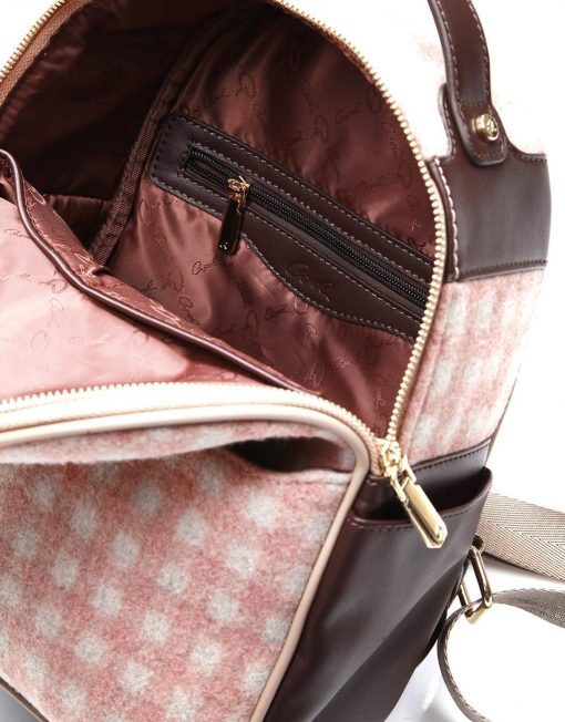 Mochila de mujer con bolsa interior. Consenuado en tela tejida a cheque, detalles coriáceos y espalda acolchada coriácea. Cuenta con detalle de monograma cortado con láser, caja frontal con cremallera y cajas interiores.