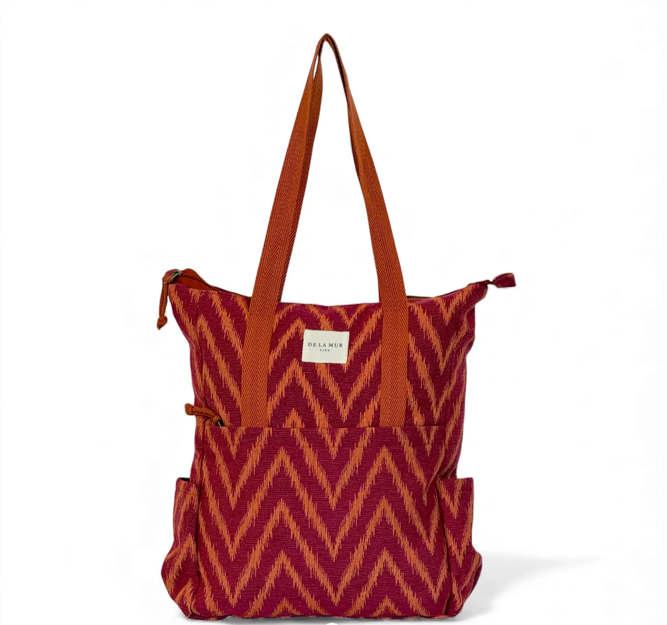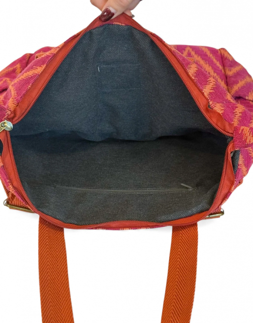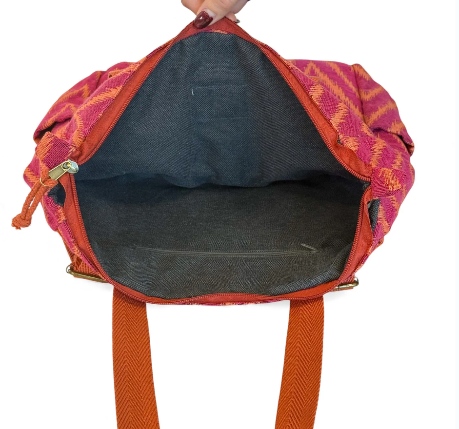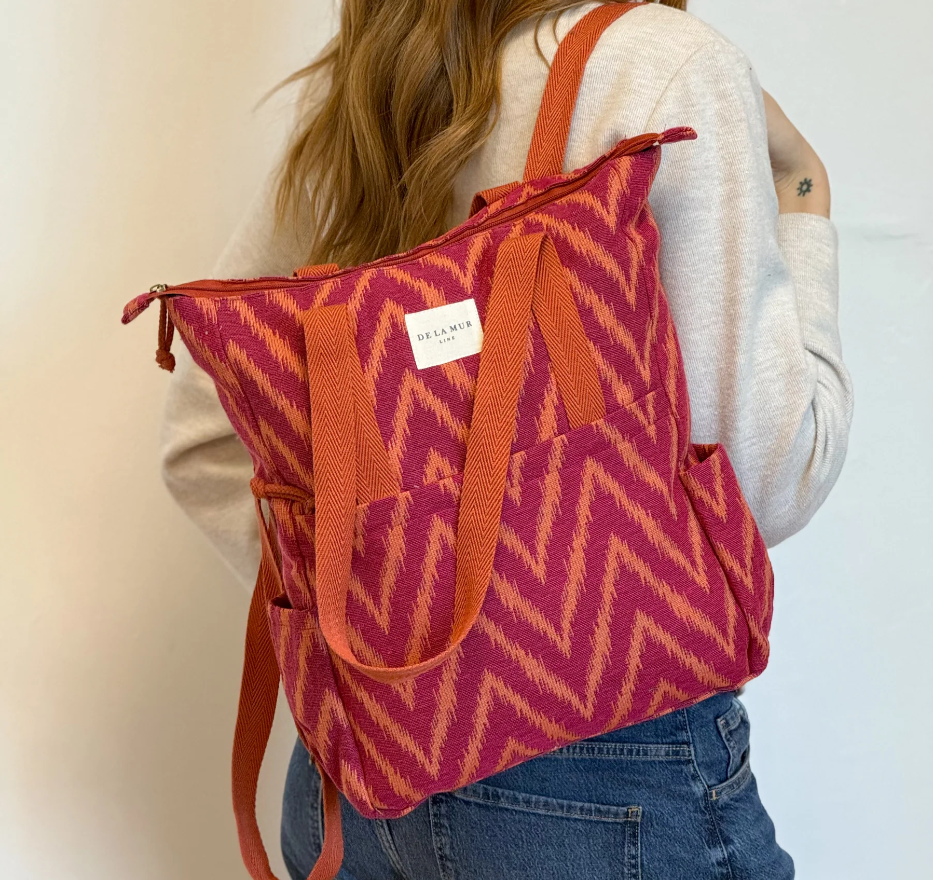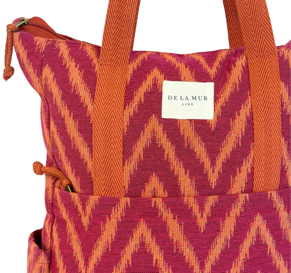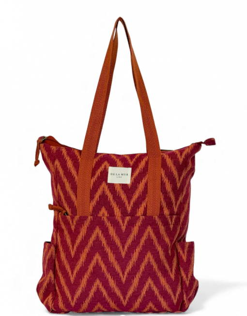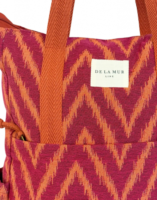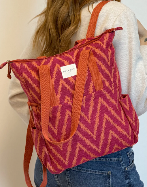 Mochila con asas ajustables y dos asas en la parte central para llevar al hombro tipo bolso. Con tejido grueso de jacquard 80% algodón y 20% poliéster con estampado tipo zigzag en tonos fucsia y naranja. Bolsillo interior con cremallera. Asas de cinta de espiga de algodón de color naranja. Para su correcto mantenimiento se aconseja lavarlo en frío y no utilizar secadora.