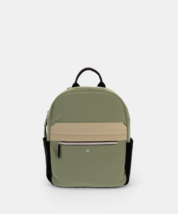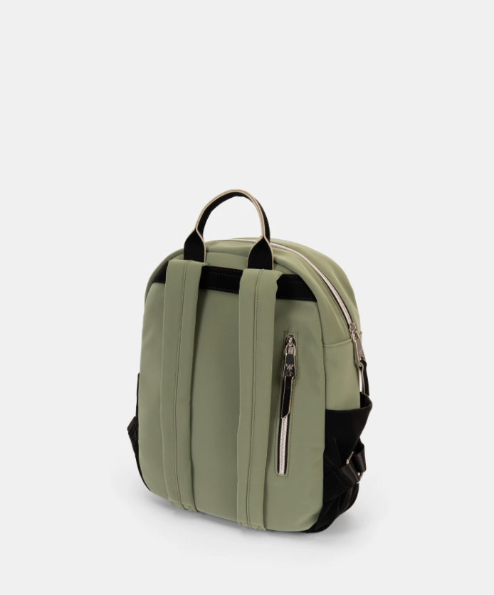 En su exterior, destaca un bolsillo frontal con cremallera de fácil acceso, además de bolsillos laterales abiertos y un bolsillo trasero vertical tipo antirrobo, ideal para proteger tus objetos más valiosos. Su logo metálico en forma de mariposa añade un detalle distintivo.