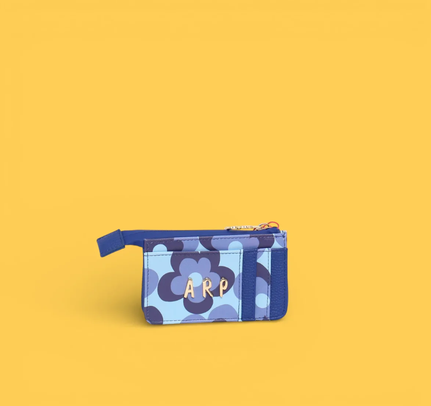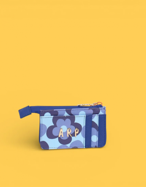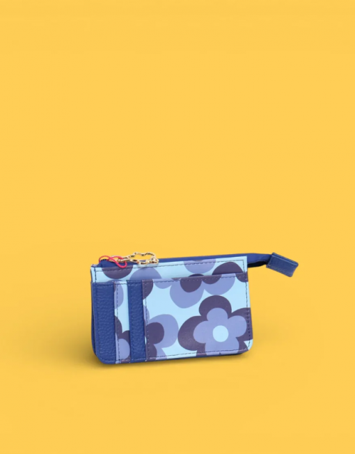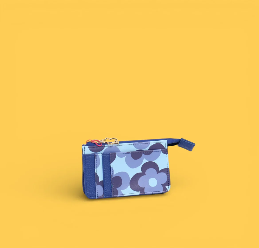 Monedero con diseño floral en tonos azules que combina funcionalidad y estilo. Perfecto para guardar monedas, tarjetas y efectivo en un accesorio compacto y elegante. Su patrón de flores aporta un toque femenino y colorido a tu día a día. Ideal como regalo o complemento personal.