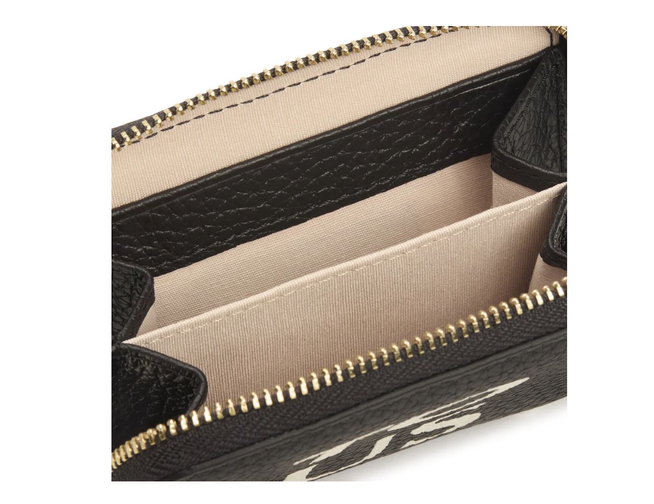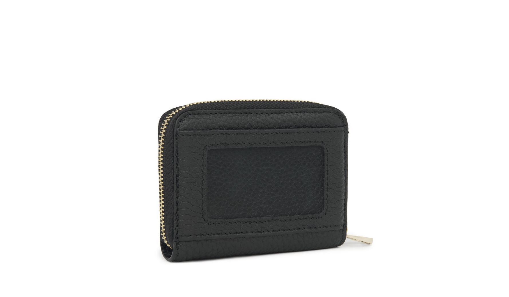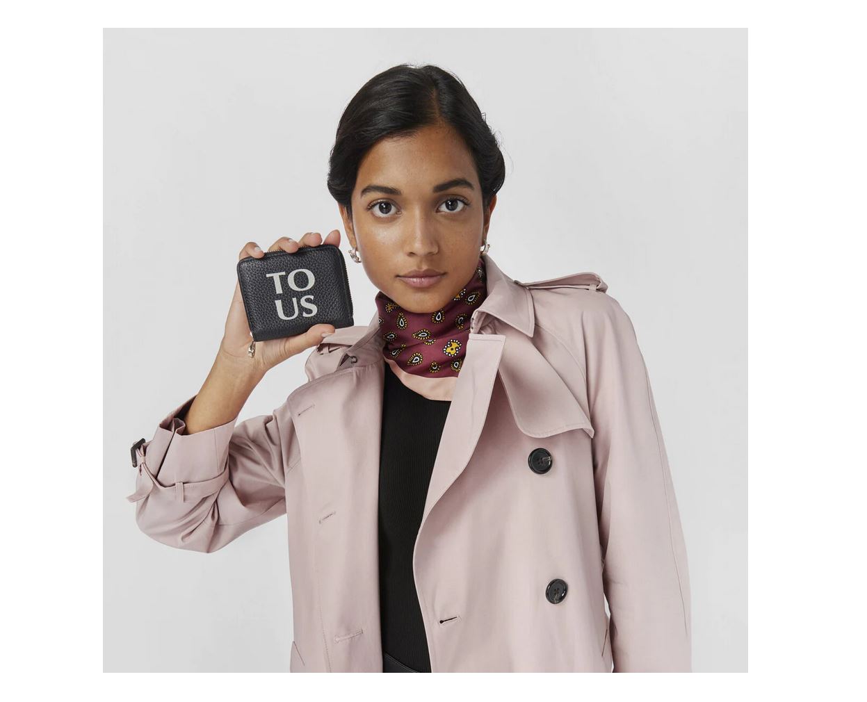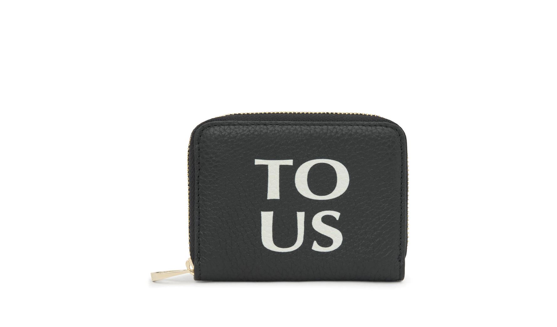 Monedero TOUS Balloon de piel vacuna con certificación LWG en color negro. Cierre de cremallera. En el interior cuenta con dos compartimentos abiertos para monedas y dos ranuras para tarjetas. En el exterior hay una ranura abierta y transparente para llevar una tarjeta o el DNI. Medidas (alto x ancho x fondo): 8 x 10,5 x 2 cm.