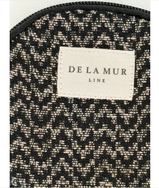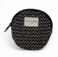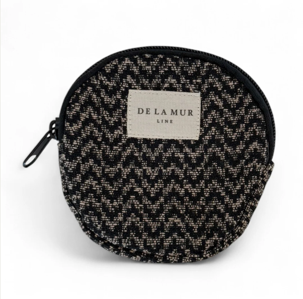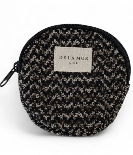 Monedero redondo con cremallera en la parte superior y pequeña asa de cordón de color negro en el lateral. Con tejido grueso de jacquard con estampado tipo zigzag en tono beige y negro. Cada articulo puede tener una variación en el estampado, dependiendo de donde se haya efectuado el corte de la pieza. Forrado de tejido grueso de color gris en la parte interior. Para su correcto mantenimiento se aconseja lavarlo en frío a mano y no utilizar secadora.