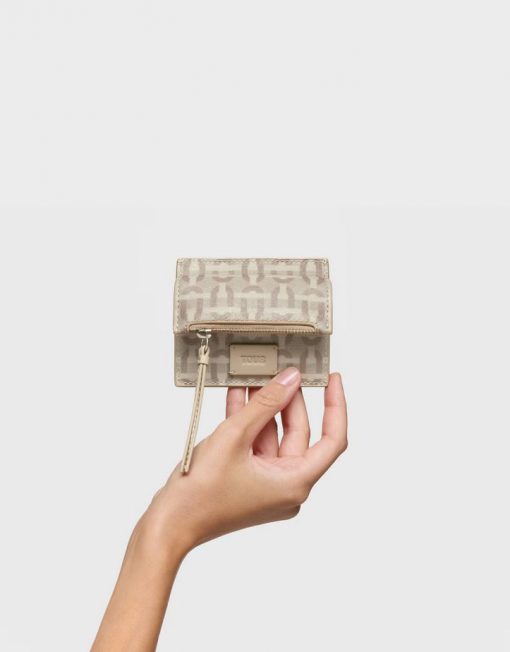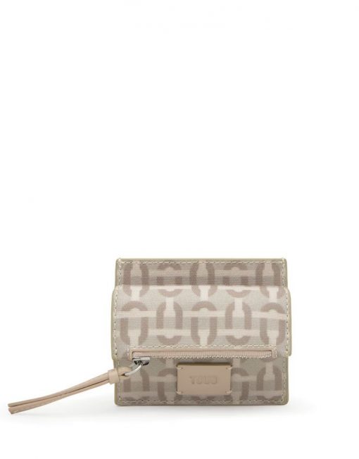 Monedero tarjetero solapa TOUS Double Way Manifesto de algodón y poliéster reciclado en color arena. Cierre de botón a presión. Contiene tres ranuras para tarjetas, un bolsillo con cremallera y un compartimento para monedas. Medidas (alto x ancho x fondo): 8,5 x 10 x 3,3 cm.