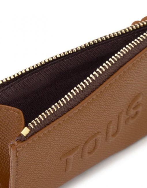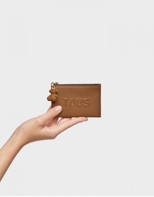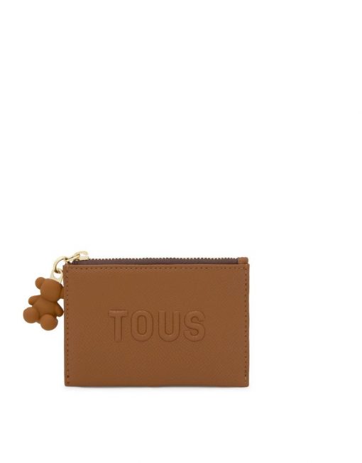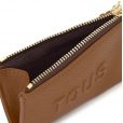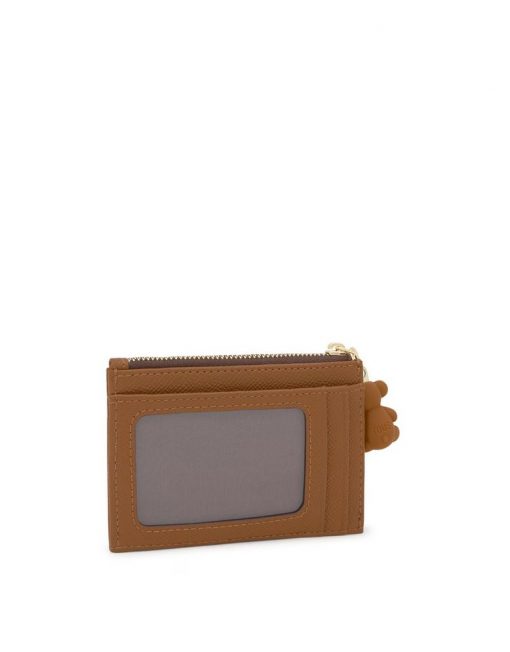 Monedero tarjetero TOUS Brenda de poliuretano en color camel. Compartimento especial para monedas con cierre de cremallera. En la parte trasera cuenta con tres ranuras para tarjetas, una de ellas transparente. Medidas (alto x ancho x fondo): 8,5 x 11,5 x 1 cm.