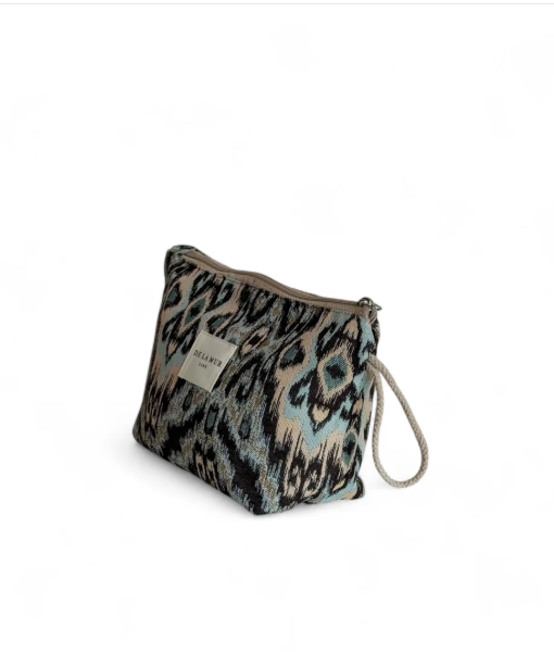 Neceser con cremallera en la parte superior y asa de cordón de color beige en el lateral. Con tejido grueso de jacquard con estampado geométrico de color azul claro. Forrado de tejido grueso de color gris en la parte interior. Para su correcto mantenimiento se aconseja lavarlo en frío a mano y no utilizar secadora.