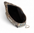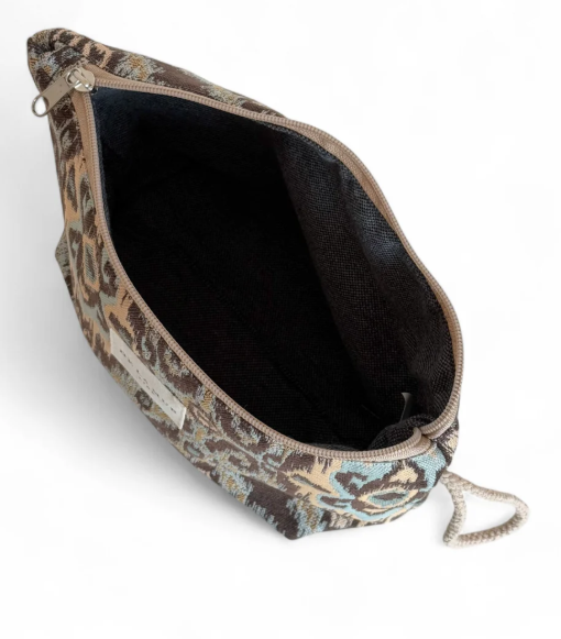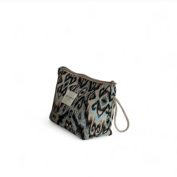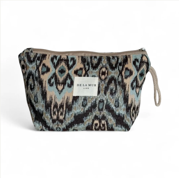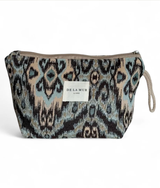 Neceser con cremallera en la parte superior y asa de cordón de color beige en el lateral. Con tejido grueso de jacquard con estampado geométrico de color azul claro. Forrado de tejido grueso de color gris en la parte interior. Para su correcto mantenimiento se aconseja lavarlo en frío a mano y no utilizar secadora.