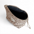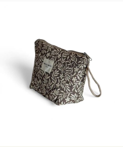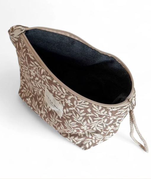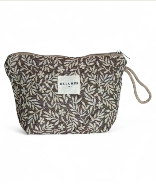 Neceser con cremallera en la parte superior y asa de cordón de color beige en el lateral. Con tejido grueso de jacquard con estampado floral en tono crudo sobre fondo marrón. Forrado de tejido grueso de color gris en la parte interior. Para su correcto mantenimiento se aconseja lavarlo en frío a mano y no utilizar secadora.