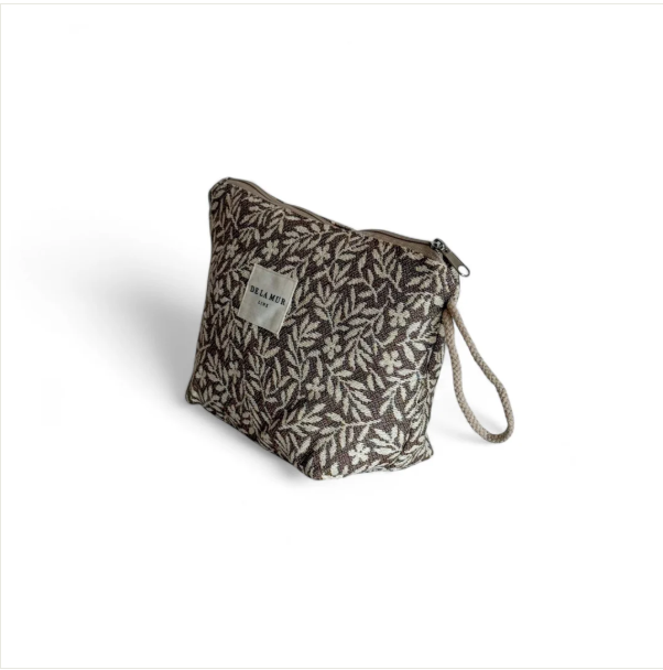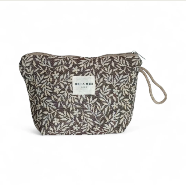 Neceser con cremallera en la parte superior y asa de cordón de color beige en el lateral. Con tejido grueso de jacquard con estampado floral en tono crudo sobre fondo marrón. Forrado de tejido grueso de color gris en la parte interior. Para su correcto mantenimiento se aconseja lavarlo en frío a mano y no utilizar secadora.