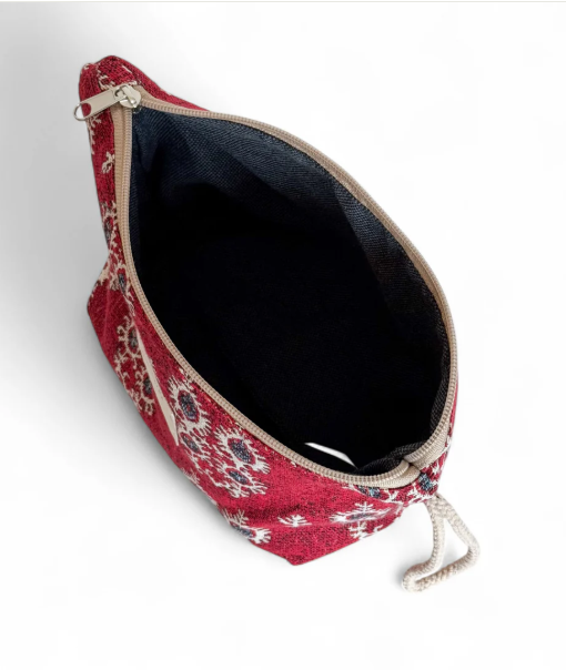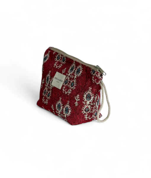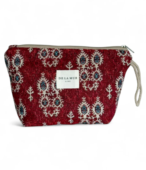 Neceser con cremallera en la parte superior y asa de cordón de color beige en el lateral. Con tejido grueso de jacquard con estampado geométrico de color granate. Forrado de tejido grueso de color gris en la parte interior. Para su correcto mantenimiento se aconseja lavarlo en frío a mano y no utilizar secadora.