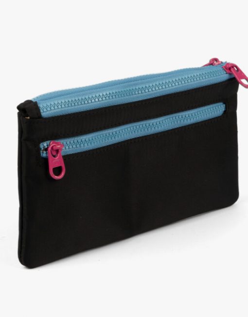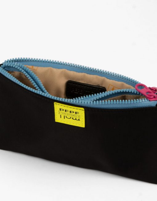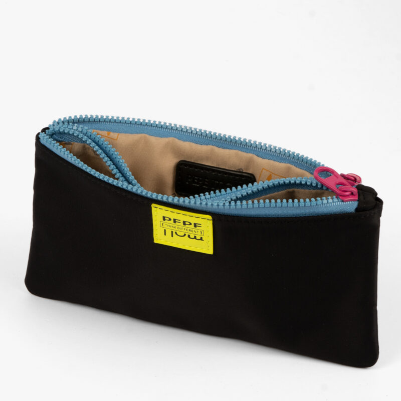 Cartera mediana vegana. Color negro. Estilo nylon. Cierre de cremallera. Dos compartimentos principales con cierre de cremallera y diferentes para llevar tus monedas o dinero con seguridad. Interior forrado. Logotipo en parte frontal. Contraste de tonalidades. Con un estilo moderno y actual.