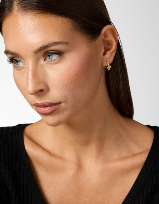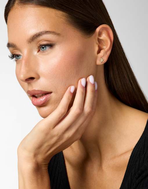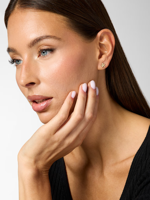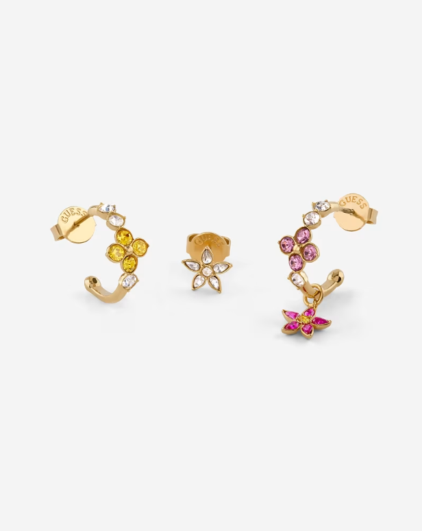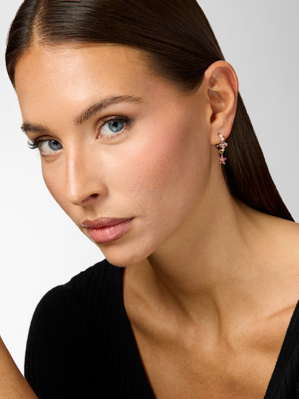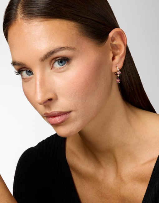 Pendientes de acero inoxidable. Cristales en forma de flor. Apliqué de circonita cúbica. Cierre de mariposa.