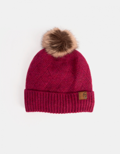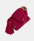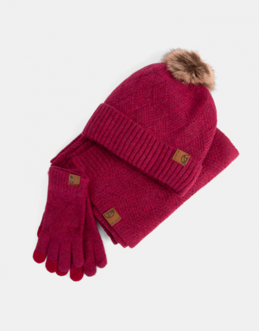 El tejido principal de las tres piezas presenta un elegante patrón en relieve con diseño de espiga o zigzag, que aporta una textura envolvente y un acabado muy especial. El gorro tipo beanie incorpora un pompón de pelo sintético en el mismo tono y un dobladillo grueso acanalado que mejora el ajuste y la calidez.