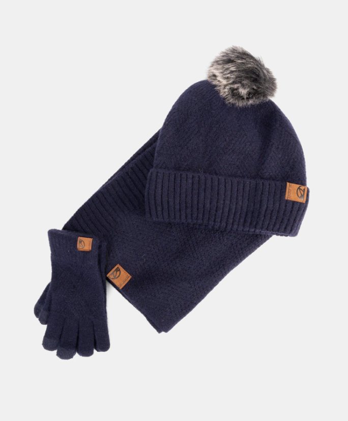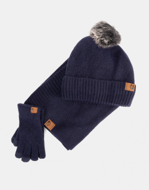 El tejido principal de las tres piezas presenta un elegante patrón en relieve con diseño de espiga o zigzag, que aporta una textura envolvente y un acabado muy especial. El gorro tipo beanie incorpora un pompón de pelo sintético en el mismo tono y un dobladillo grueso acanalado que mejora el ajuste y la calidez.