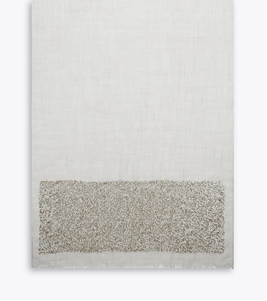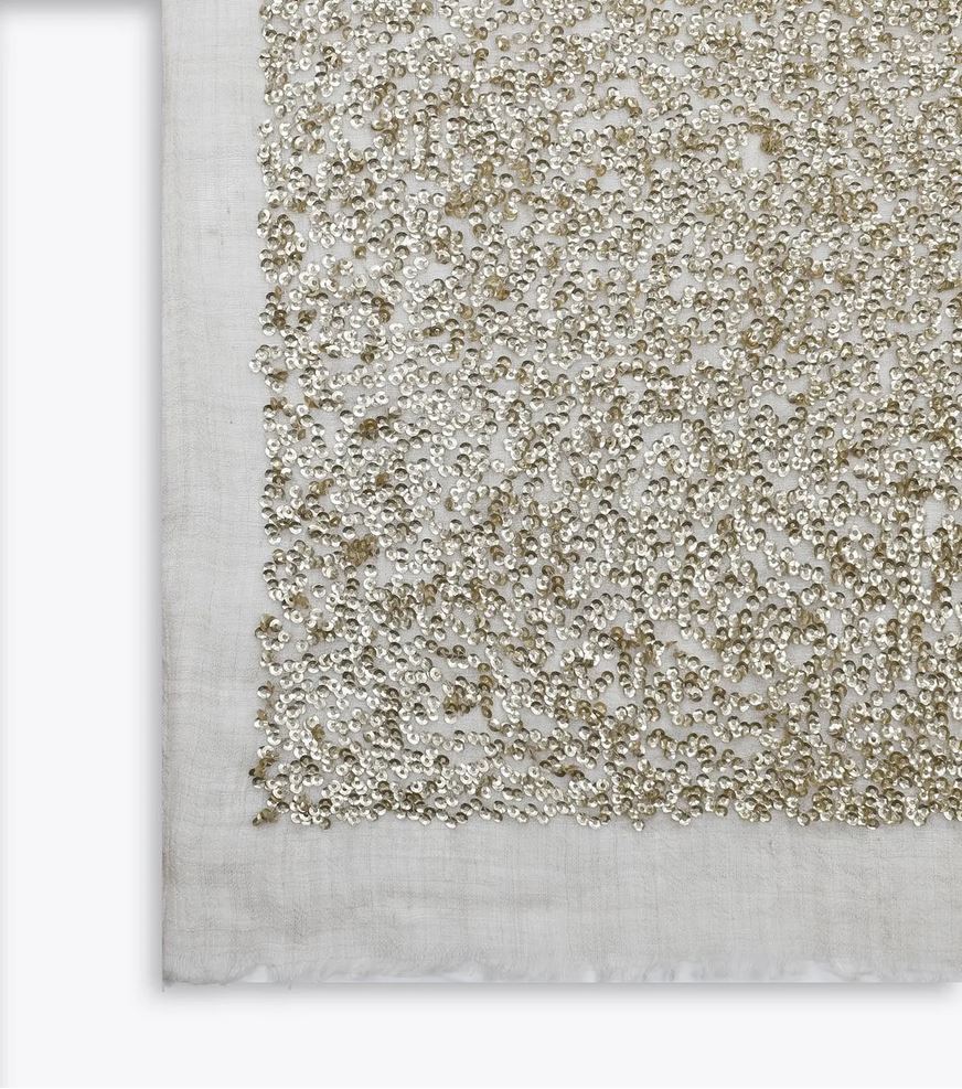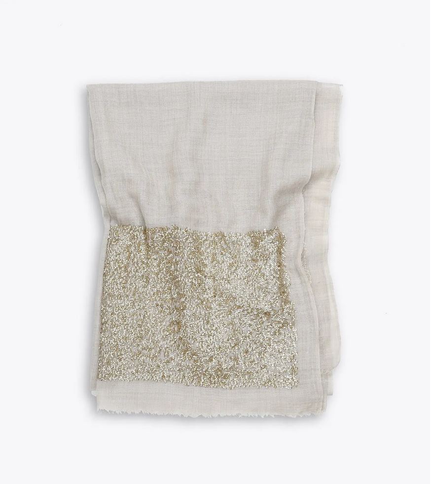 Bufanda con tono gris con latas de oro cosida. Elige la forma en que lo estilarás. Ya sea que lo use en el cuello o ató el cabello en una cola de caballo, incluso si lo atas a tu bolso le añadirá un toque elegante.