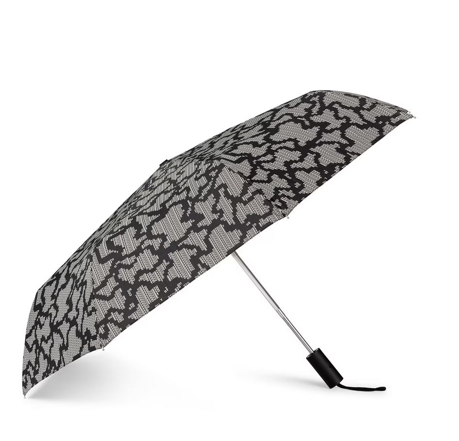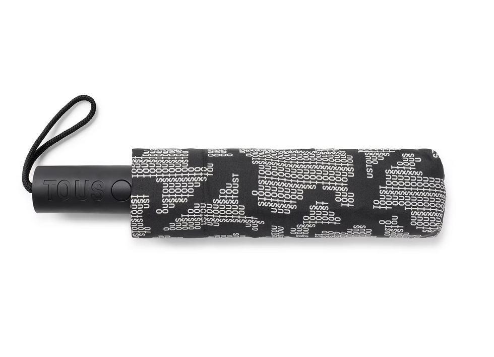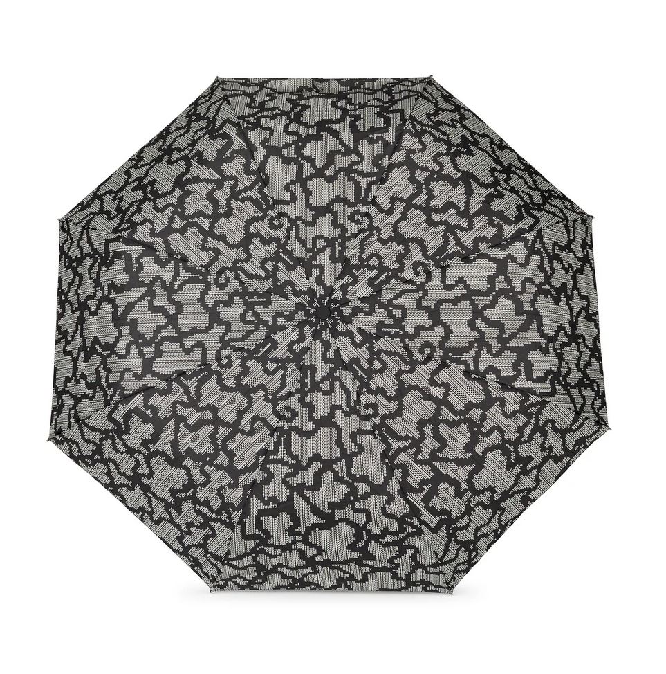 Paraguas plegable TOUS Kaos Pix de poliéster con estampado en color negro. Incluye una funda para guardar y proteger el paraguas.