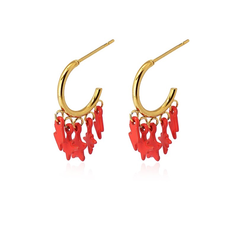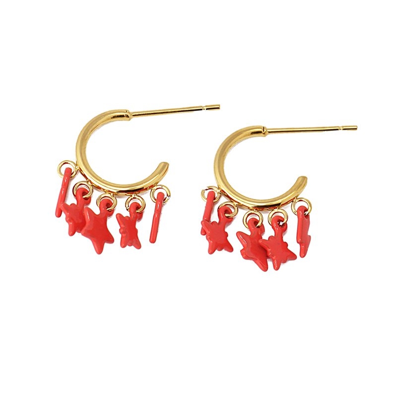 Mini aros con abalorios en forma de estrellas variadas. Lo puedes elegir en color turquesa o coral, con textura pintado con spray. De acero quirúrgico con baño de oro, son pendientes para mujeres con personalidad. Son ligeros, cómodos, no oxidan, son resistentes al agua y no producen alergia. Cierre a presión tipo mariposa. Miden 12 mm de diámetro. ¿Te los compras?