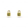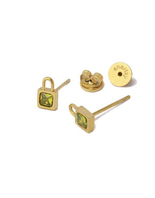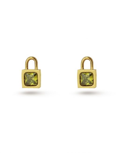 Pendientes pequeños en forma de candado con circonita coloreda a elegir entre verde o negro. Sencillos pero originales, son el accesorio ideal para no quitarte de las orejas. Realizados en acero quirúrgico, no producen alergia, se pueden mojar y no oxidan. Miden aproximadamente 8 mm y cuentan con sistema de cierre a presión tipo mariposa.