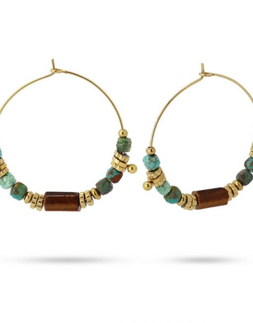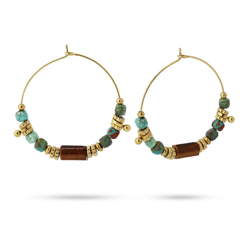 Pendientes de acero quirúrgico hipoalergénico dorado con cuentas de 5 mm de piedra natural coloreada, realizados a mano. Disponibles en dos tonalidades tendencia, son de inspiración bohemia y favorecen muchísimo. Miden 40 mm de diámetro. Disponible pulsera y collar a juego.