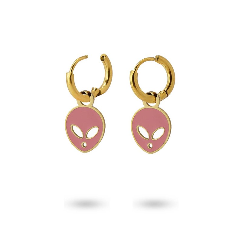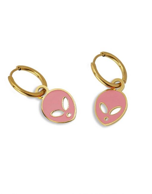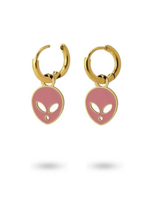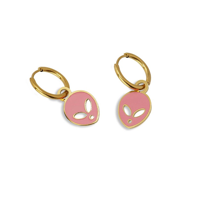 Pendientes tipo mini aros con cierre oculto y abalorio plano con forma de cara de extraterrestre esmaltado en vivos colores. Súper cómodos de llevar, aportan frescura a tus looks diarios. Combínalos con su collar, anillo o pulsera a juego. Son de acero quirúrgico hipoalergénico en color dorado. El arete mide 12 mm y el abalorio 12 mm. ¡Ideales!