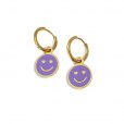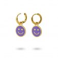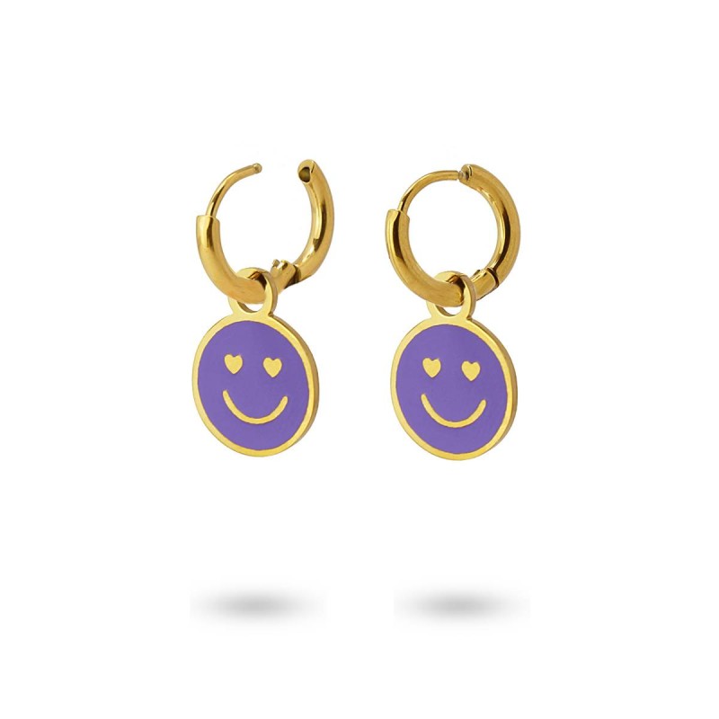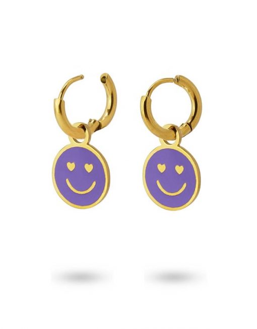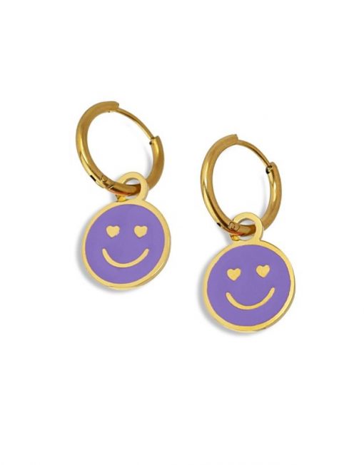 Pendientes en forma de mini aros de acero quirúrgico color dorado y cierre oculto. Cuenta con abalorio plano en forma carita sonriente. Divertidos, juveniles y favorecedores, están disponibles en color rosa o morado. Quedan genial con looks informales en colores claros. El arete mide 12 mm y el corazón 12 mm. No producen alergia. ¡Sonríe a la vida!
