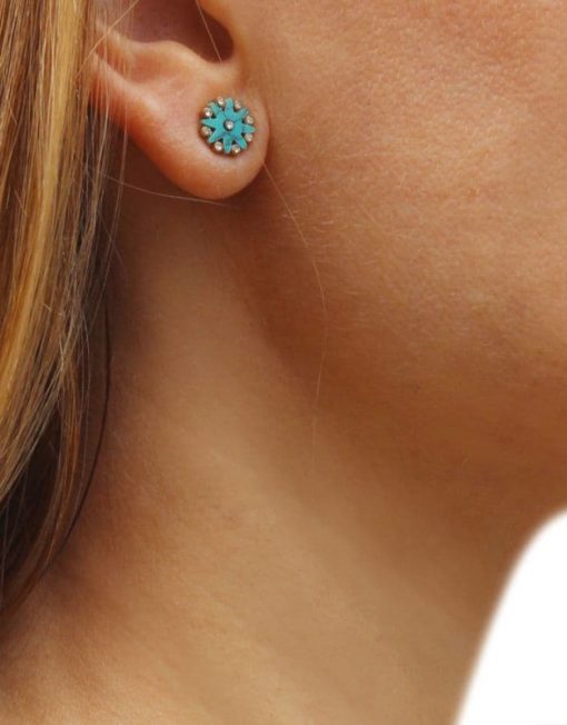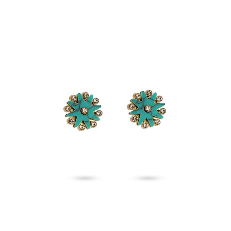 Pendientes pequeños en forma de estrella de piedra natural y circonitas. Dale un toque especial a tus looks de diario y combínalos con su anillo o collar a juego. Son de acero quirúrgico color oro, miden 8 mm de diámetro y lleva pasador con cierre a presión tipo mariposa. Hipoalergénicos.