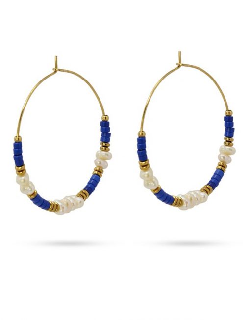 Preciosos pendientes con abalorios en forma de discos de piedra natural y perlas de agua dulce.. Son unos aros fantásticos para aportar luz y color al rostro. Disponibles en color azul, verde y negro. Miden 35 mm de diámetro. No producen alergia y se pueden mojar.