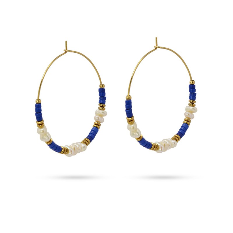Preciosos pendientes con abalorios en forma de discos de piedra natural y perlas de agua dulce.. Son unos aros fantásticos para aportar luz y color al rostro. Disponibles en color azul, verde y negro. Miden 35 mm de diámetro. No producen alergia y se pueden mojar.
