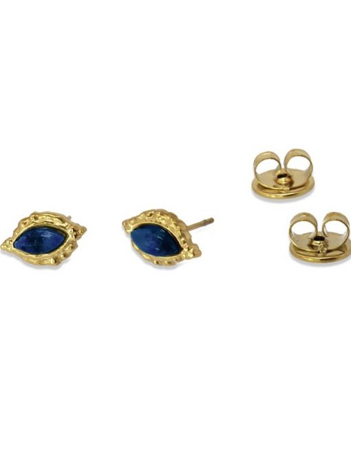 Pendientes pequeños con diseño en forma de ojo de de acero quirúrgico hipoalergénico. Sencillos pero con personalidad, son ideales para llevar día y noche sin preocuparte de nada, ya que además de ser muy versátiles no provocan alergias y se pueden mojar. Miden 8 mm y llevan pasador con cierre a presión tipo mariposa. Disponibles en color verde, azul y negro.