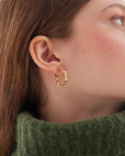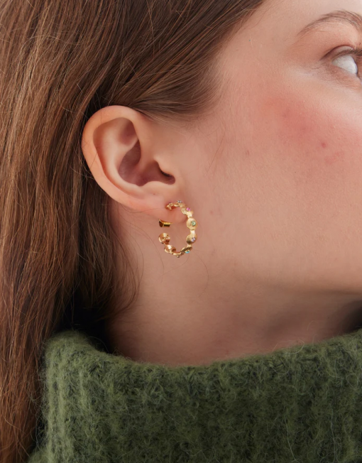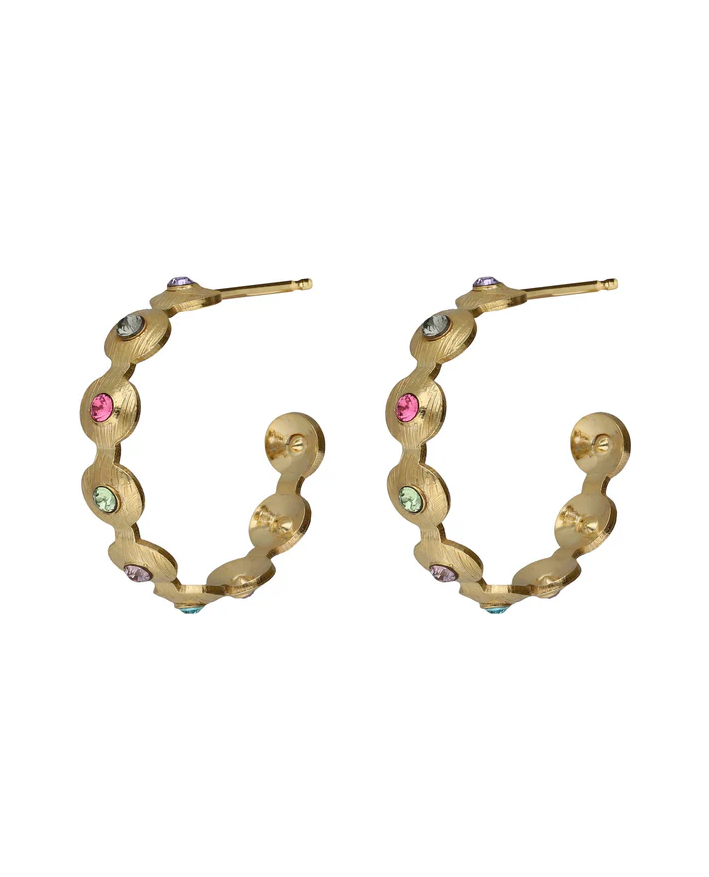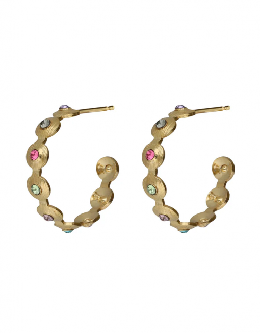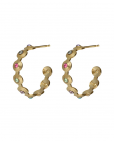 Pendientes aro con cristal multicolor de Plata de Ley bañada en Oro de 18kt. Tamaño del motivo de 0,5cm y diámetro del aro de 2,5cm en forma de círculo. Tamaño del cristal 0,2cm con cierre tuerca a presión de la colección Bruma