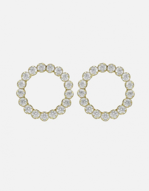 Pendientes cortos de cristales riviere y Plata de Ley. Tamaño del motivo de 1,5×1,5cm con forma de círculo y color blanco de la colección Halo