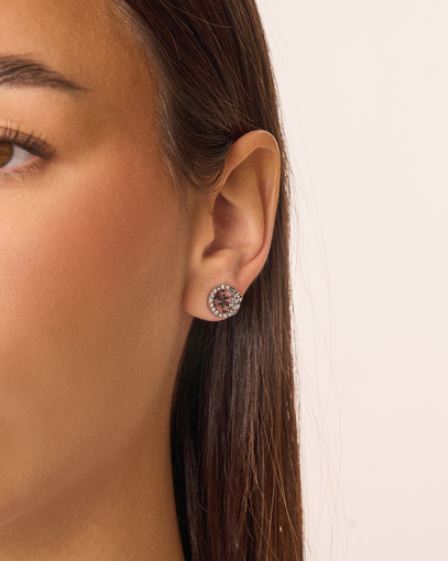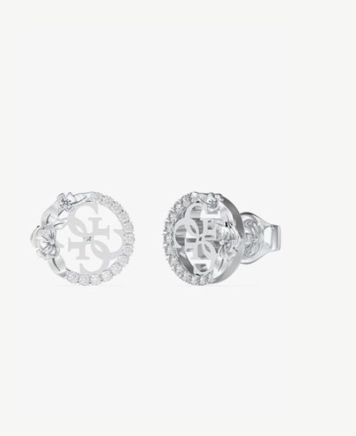Pendientes de acero para mujer de la marca Guess. Pendientes plateados de botón con logo 4G rodeado de flores y cristales blancos. Romance y feminidad se unen en 4LOVE, una colección que combina flores, cristales brillantes y el icónico logo 4G, creando piezas que irradian elegancia y encanto en cada detalle.