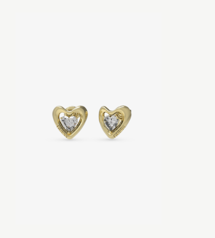 Pendientes de acero para mujer de la marca Guess. Pendientes dorados de botón en forma de corazón con cristal en el centro y logo Guess grabado a un costado. BELOVED, una colección que fusiona corazones de gran tamaño y cristales, irradiando amor y sofisticación en cada pieza. El complemento ideal para quienes desean un símbolo de afecto y distinción.