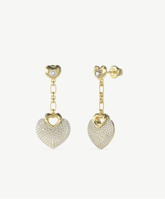 Pendientes de acero para mujer de la marca Guess. Pendientes dorados colgantes con botón de corazón de cristal blanco y corazón colgante en pavé de cristales blancos. Sumérgete en la pasión y el encanto de Crazy in Love, donde corazones entrelazados y pavé de cristales se unen para crear piezas que irradian amor y sofisticación.