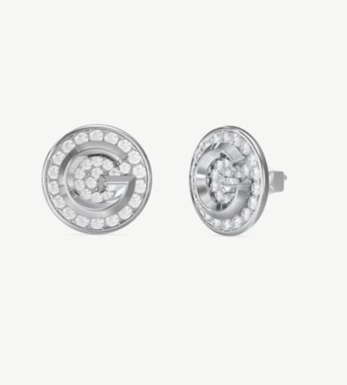 Pendientes de acero para mujer de la marca Guess. Pendientes plateados de botón con G sobre un fondo de pedrería. 10mm. La icónica G de la marca es el motivo principal de la colección G Crystal, perfecta para deslumbrar.